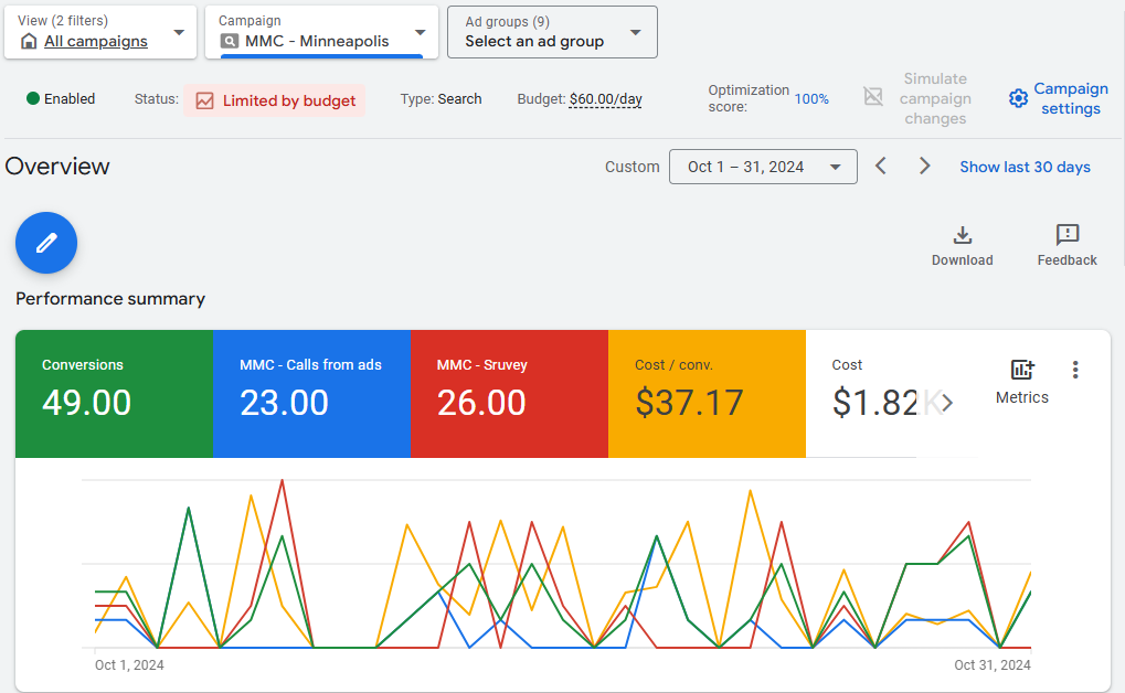 All moving company owners have negative experiences with Google ads. Some have tried doing it alone, and others have just heard stories from other owners: Google ads don’t work / They are too expensive / low-quality, and so on. All our clients have great results and are always asking to increase their daily budget. Here is one example: this is the first month of Google Ads for one of our clients, which spent $1,820 for 49 conversions. He got 23 calls directly from ads and 26 surveys submitted on his website. Also, he got 18 phone calls from their website, which Google Ads does not track. So his cost per conversion was $27,16.